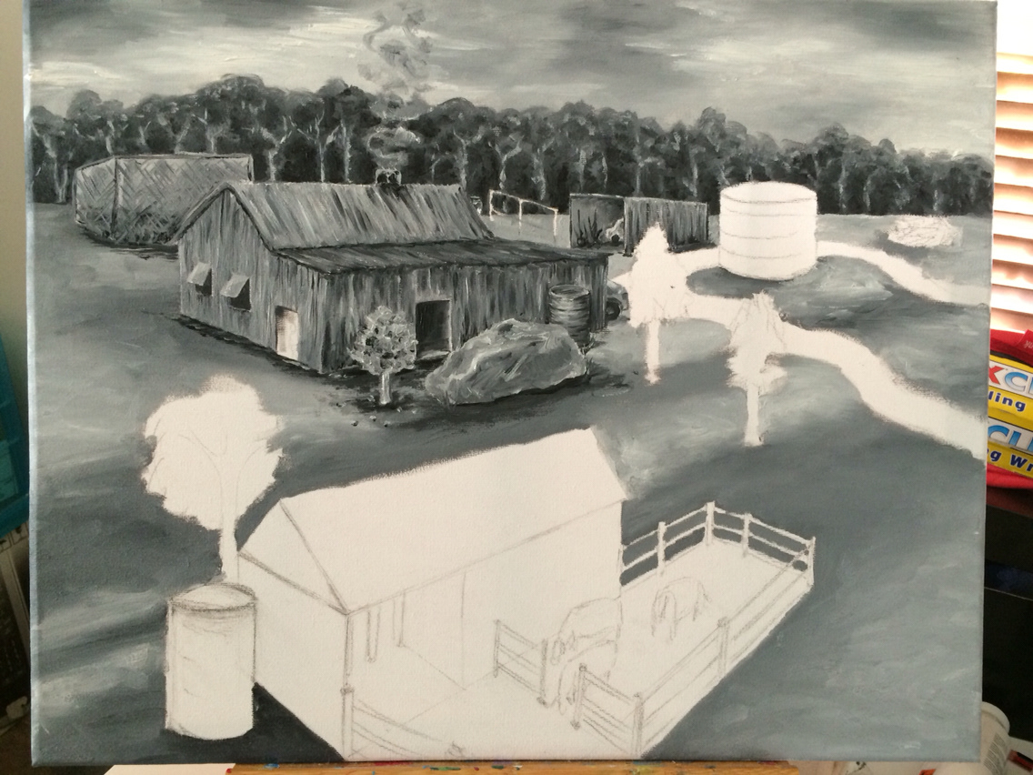 Finally completed, dried, and gifted :) 12 months in the making - this is a memory recreated from the description given by an 80 year old man of a place which no longer exists and never had any images captured of it. His childhood home. Most challenging piece I've ever done. #nofilter #blackandwhite #oilpainting #history #paintingmemories